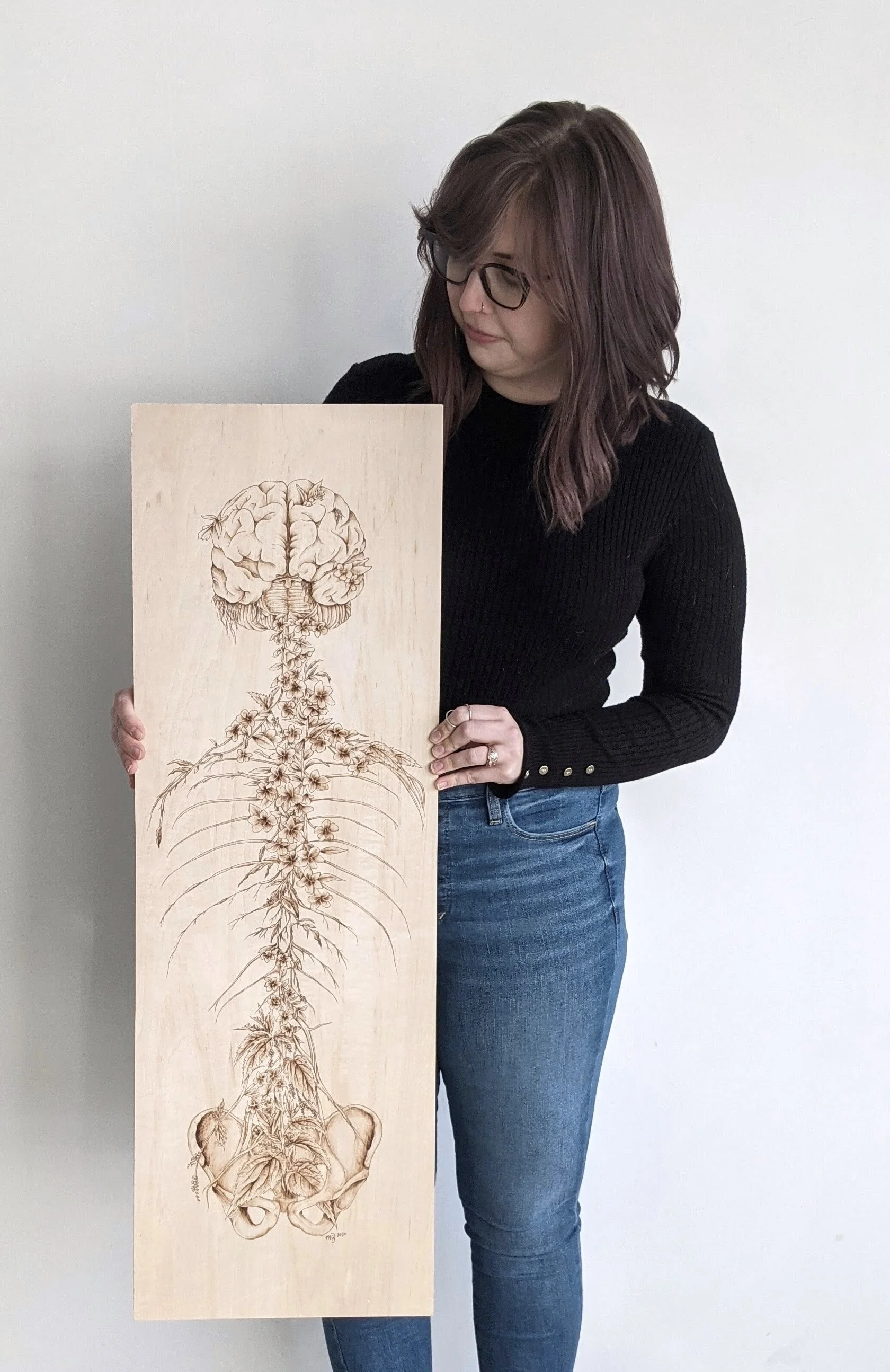 Megan found wood-burning in fall of 2017 as a way to fill the time between graduate school and her first professional job: and unstrung studios was born. A short 8 months later, a health flare forced her out of Occupational Therapy and into full-time self-employment. Armed with stacks of wood and copious amounts of coffee, it’s now been almost 8 years of burning anatomical art!