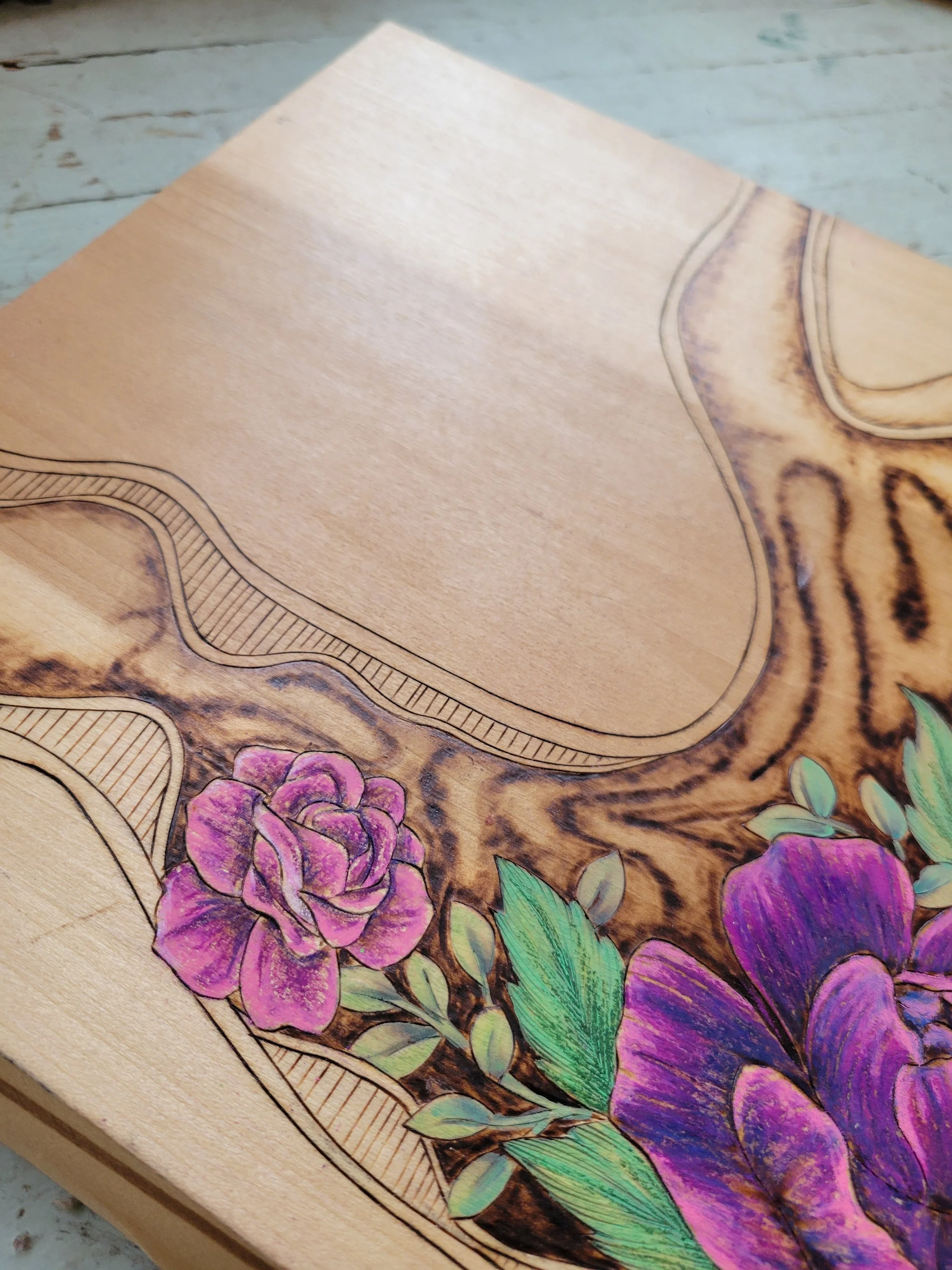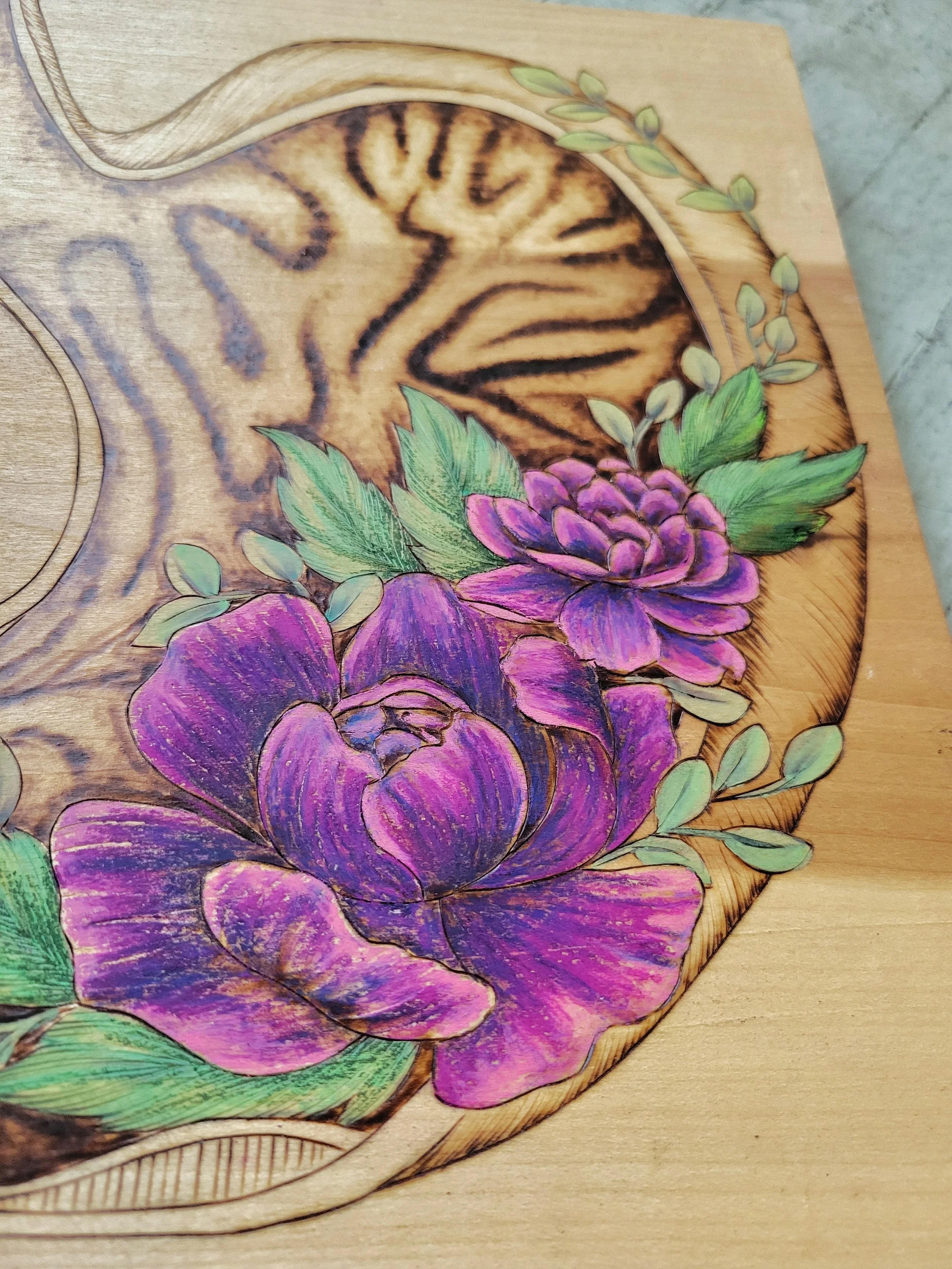 A cross section of the thoracic region, featuring the heart, lungs, and ribcage wall. Woodburned by hand.